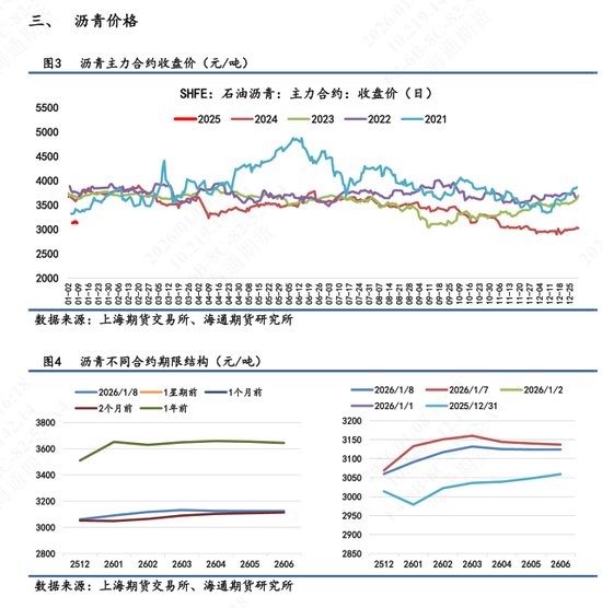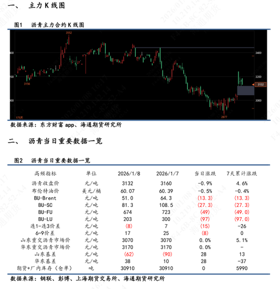 【1】盘面表现:BU 2603主力合约日内高开低走,最终收盘价3132,较昨日结算价跌幅0.70%,盘中最高触及3188,最低3128。按收盘价算近7天累计+4.6%。次月合约2602较昨日结算价跌幅0.76%,远月合约2606则跌幅0.41%